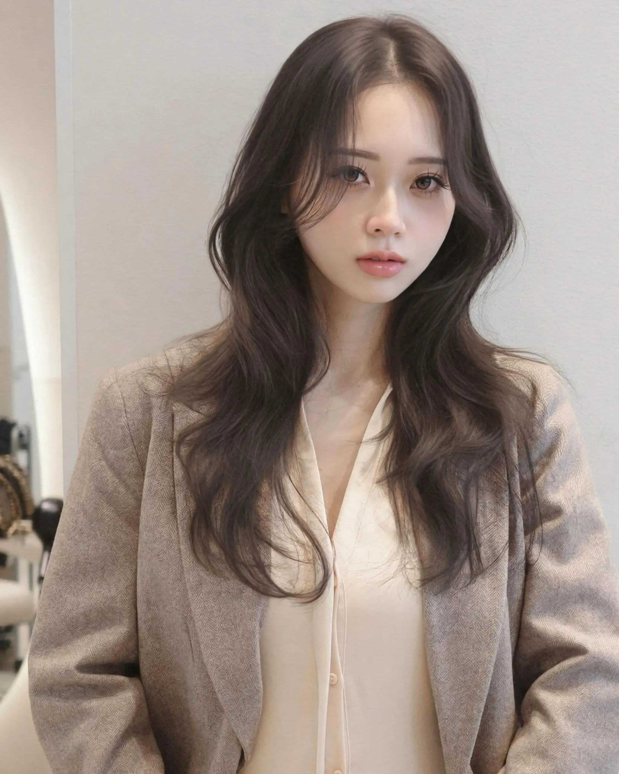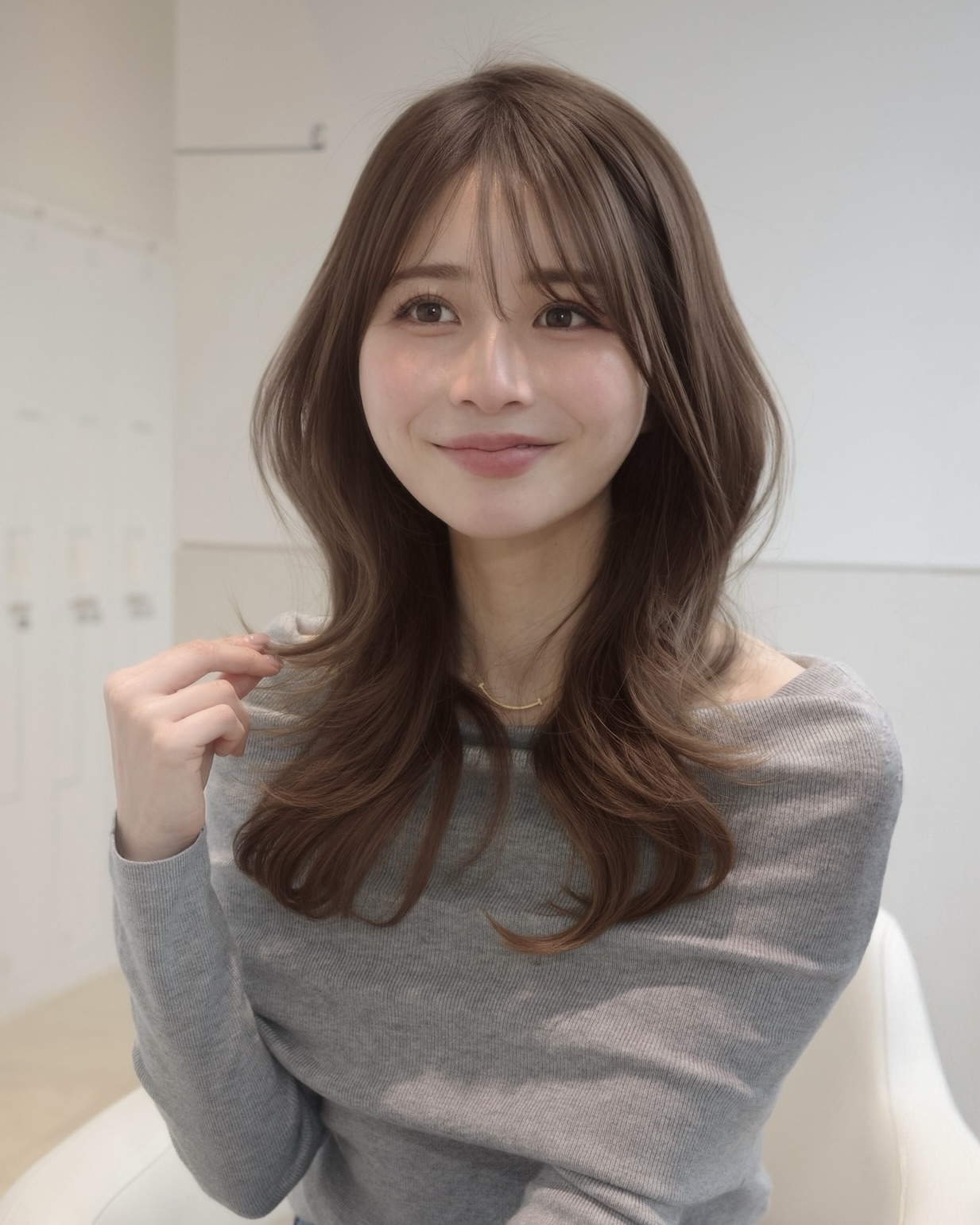 一人ひとりの髪質と骨格を見極め、レイヤーの位置と幅を緻密に計算しています。大きくゆったりしたS字カールで知的な印象を作り、首筋やデコルテも綺麗に見せます。