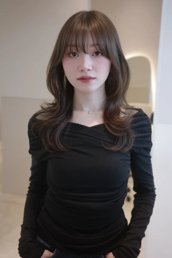 顔まわりレイヤーで小顔見せ。アッシュベージュの透明感で、セミロングが一気に垢抜ける韓国風スタイル。