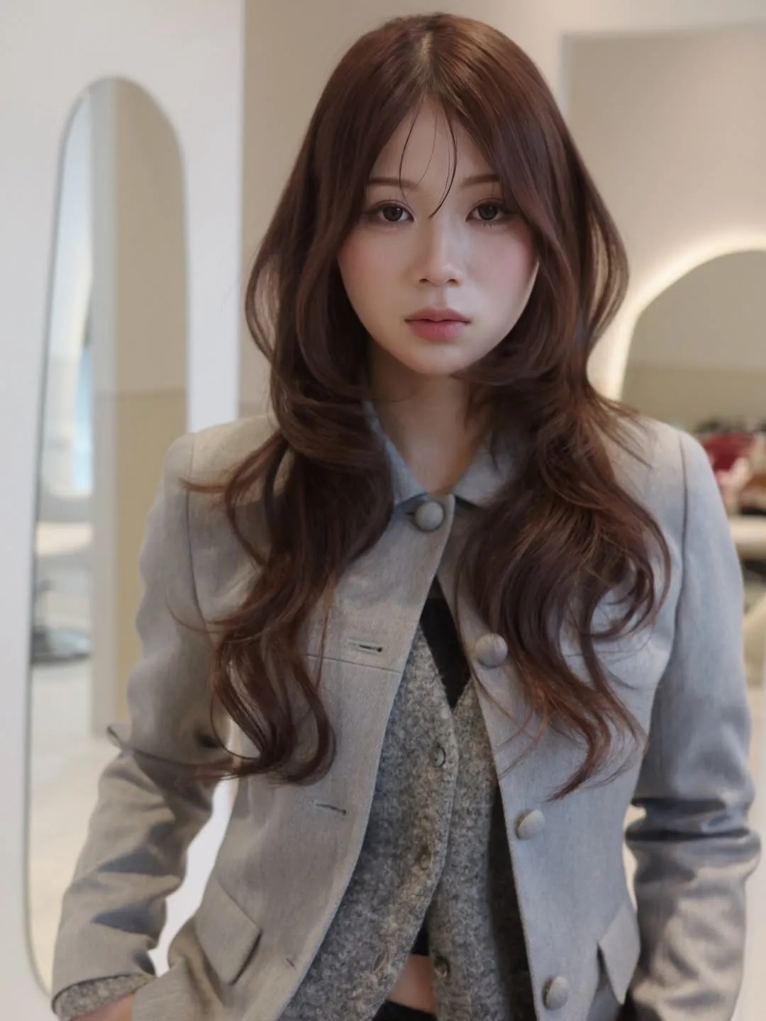 韓国ヘアの代名詞であるヨシンモリ(韓国語で「女神ヘア」の意味)は、大きなウェーブと華やかなボリューム感が魅力。ただ、そのまま取り入れると派手になりすぎることも。レイヤーの入れ方とカラーの選び方を大人仕様に調整することで、トレンド感がありながらも落ち着きのある上品なスタイルに仕上がります。